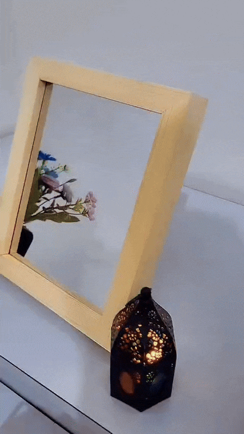الأفضل لأغراض الهدايا وديكور غرفة النوم! المنتج في الأصل عبارة عن مرآة، تتحول إلى إطار صور سحري جميل عند إضاءتها! يمكنك ببساطة فتح الجزء الخلفي من الإطار ووضع صورتك المفضلة فيه.